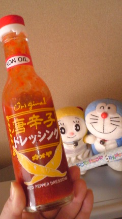 最近購入したドレッシング! その名も・・・・・・・! 唐辛子ドレッシング☆ 辛い物好物のあたしにとって 朝から手軽に辛いものを味わえるのでうれしいです。 しかも・・・・・・! ノンオイル!! これは、すごいっ。 後ろに写っているのは、電報ドラちゃんあんどドラみちゃん ドラちゃんったらさりげなくカメラ目線よね。